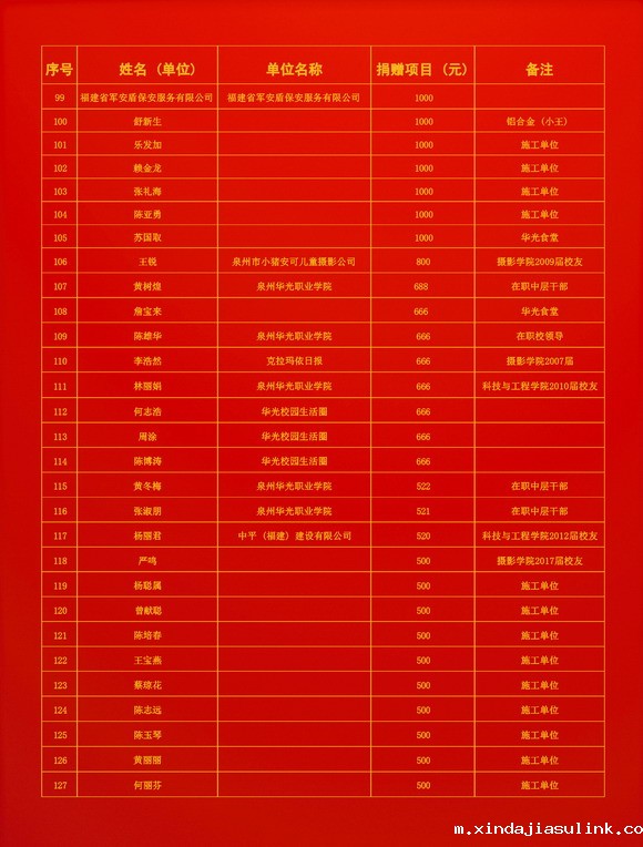 taptap点点登陆自发布30周年校庆捐赠倡议以来,各界人士、历届校友、合作企业、在职人员等纷纷响应,慷慨解囊,倾情捐助,支持我校30周年校庆,助推学校教育事业发展。截至目前(2023年3月25日),学校共收到捐赠127笔,现公示如下,并在此表示衷心的感谢和诚挚的祝福!