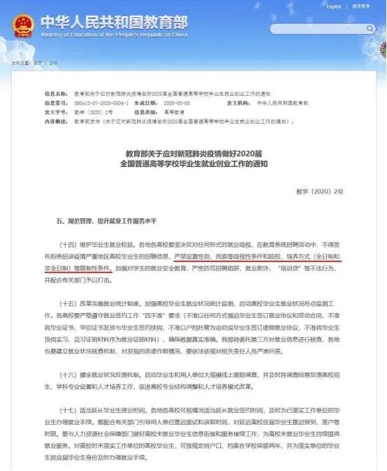 2020年3月5日国家再次发文强调:《教育部关于应对新冠肺炎疫情做好2020届全国普通高等学校毕业生就业创业工作的通知》;此通知明确指出:严禁设置性别、民族等歧视条件和院校、培养方式(全日制和非全日制)等限制条件。
